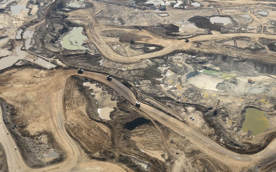 Wide-angle image of Suncor’s Millennium Mine showing machinery moving along swooping roads and between multicolour piles and ponds.